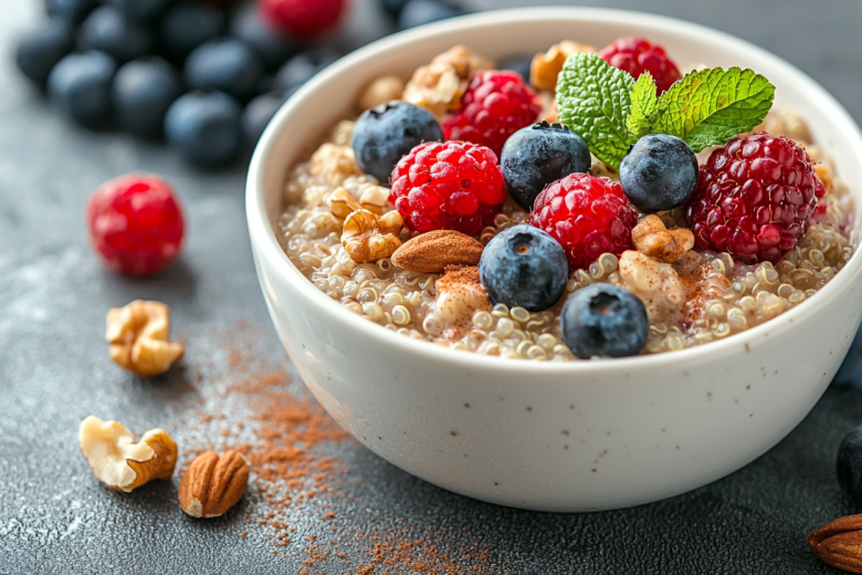 Для приготовления замочите 200 г киноа на ночь или минимум на 4–5 часов, затем тщательно промойте. В блендере измельчите крупу с 2–3 финиками, 1 ч. л. корицы, 200 мл молока и 250 мл воды. Постепенно добавляйте оставшуюся воду (80 мл), чтобы смесь не стала слишком густой. Перелейте массу в кастрюлю и варите 1 минуту, постоянно помешивая венчиком для получения однородной кремовой текстуры без комочков.