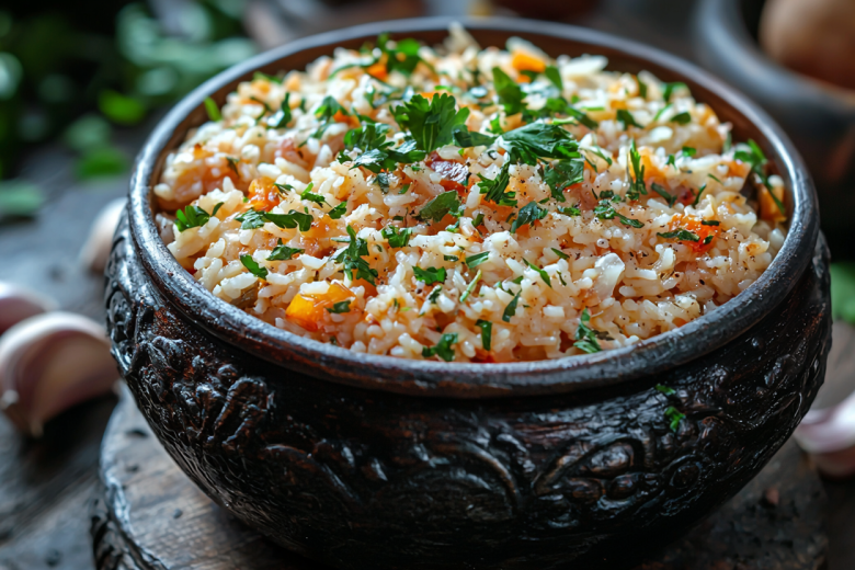Лук порезать мелкими кубиками и обжаривать на растительном масле в разогретом казане до тех пор, пока он не станет прозрачным. Добавить нарезанную соломкой морковь, смешать и жарить четверть часа. Кориандр и зиру истолочь в ступе, вместе с барбарисом и неочищенными дольками чеснока добавить в казан. Жарить, помешивая, 5 минут. Сухой рис засыпать в казан, перемешать с овощами и специями, обжаривать 5–7 минут, затем добавить воды так, чтобы она на 1,5 см покрывала крупу. Довести до кипения, убавить огонь и держать под крышкой 25 минут.