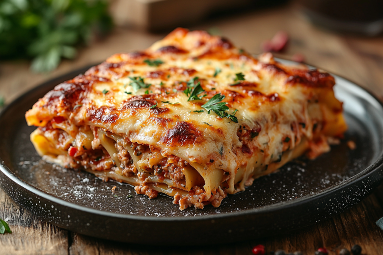 Для приготовления обжарьте 500 г фарша (говядина + свинина) с луком и чесноком, добавьте соль, перец и мускатный орех. Начините полученной массой сухие трубочки каннеллони (250 г). Для соуса бешамель растопите 50 г масла, добавьте 2 ст. л. муки, влейте 500 мл молока, взбейте до густоты, добавьте 100 г тертого пармезана. Выложите каннеллони в форму, залейте соусом, посыпьте сыром и запекайте 25 минут при 200°C.