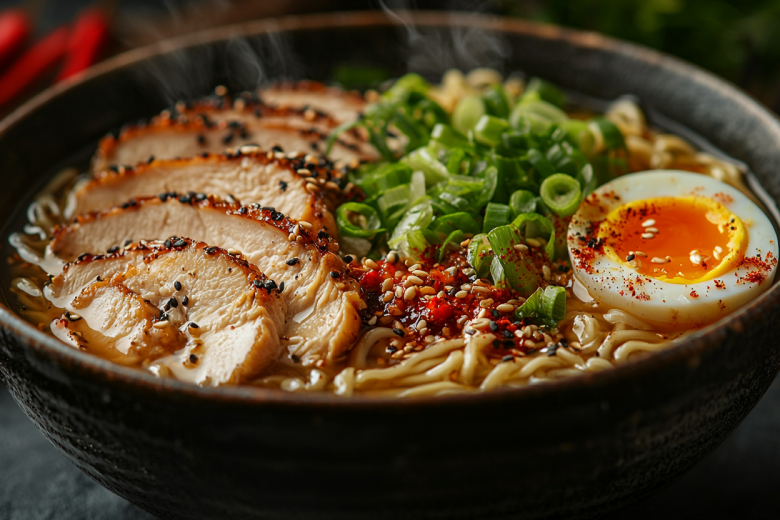 Японский суп рамен представляет собой традиционное блюдо с насыщенным вкусом и ароматом. Это сочетание отличается нежной лапшой, сочной курицей и пикантным бульоном с восточными специями. Гармония простых ингредиентов создает полноценное блюдо, которое передает вкус японской кухни.