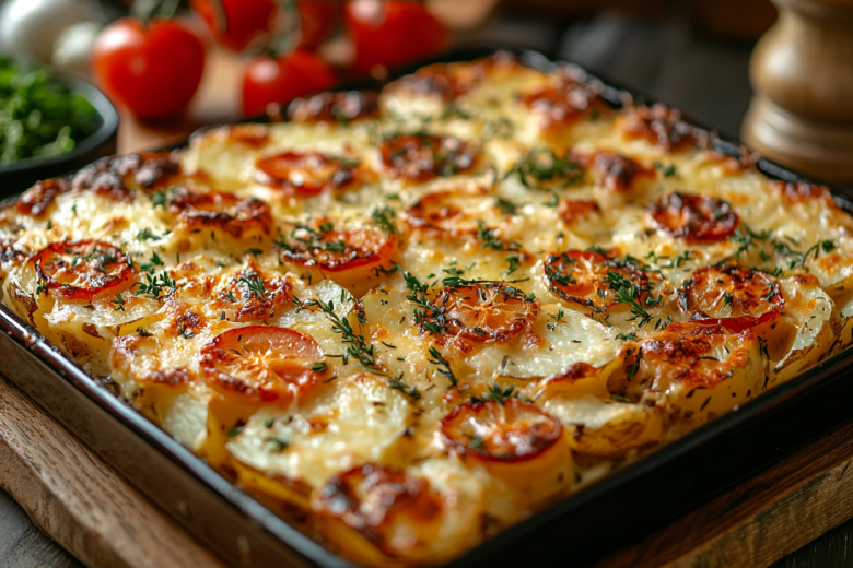 Вам понадобится: 4 картофелины, 2 куриные грудки, 1 крупная луковица, 2 помидора, 150 г твердого сыра, 180 г сметаны, соль и специи по вкусу. Картофель нарежьте тонкими колечками и выложите первым слоем на смазанный маслом противень, посолите. Куриную грудку нарежьте пластинами, лук — полукольцами. Распределите курицу и лук поверх картошки. Равномерно смажьте все сметаной. Сверху уложите кружочки помидоров и обильно посыпьте тертым сыром. Запекайте в разогретой до 180 °C духовке около 35–40 минут до мягкости картофеля и аппетитной золотистой корочки на сыре.