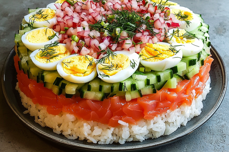 Соберите салат слоями: рис с заправкой, красная рыба, укроп, красный лук, огурцы с заправкой, яйца с зелёным луком, морковь сверху, смазанная оставшейся заправкой. Дайте пропитаться 2–3 часа или оставьте на ночь. Перед подачей украсьте кунжутом, маринованным имбирём или зелёным луком. Этот салат станет звездой новогоднего стола.